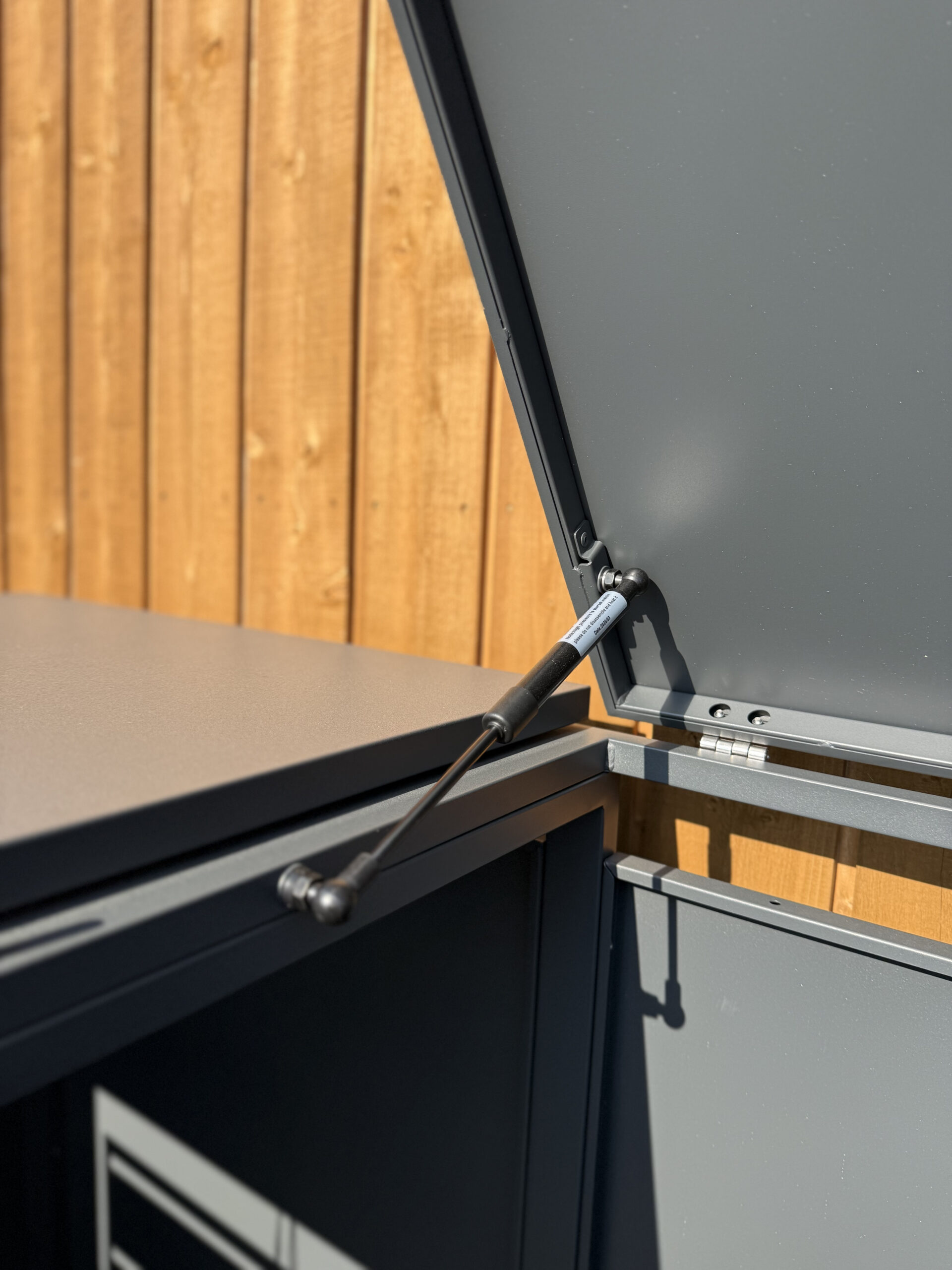 Prügikastide kuuri pind on pulbervärvitud, mis kaitseb korrosiooni, UV-kiirguse ja mehaaniliste kahjustuste eest. Populaarne antratsiithall värv peidab hästi mustuse ja sobib paljude õue või hoonete välislahendustega. Magnetlukud – tagavad, et uksed püsivad suletuna ka tuulise ilmaga.