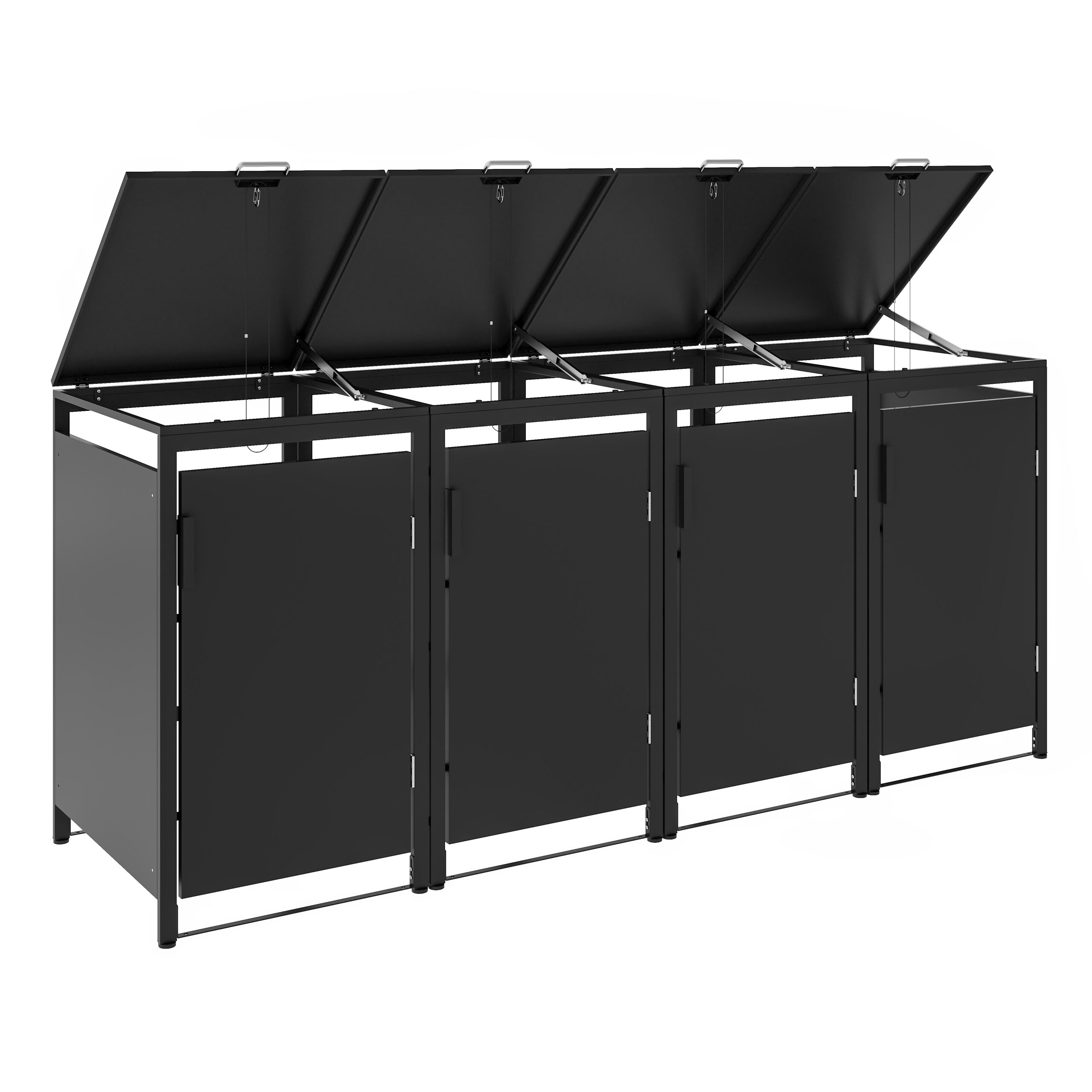See neljakohaline prügikastide kuur on vastupidav ja esteetiline lahendus nelja prügikonteineri varjamiseks. Tsingitud terasest valmistatud prügikastide varikatus tagab tugevuse, vastupidavuse ja sobib ideaalselt igasse keskkonda. Ideaalne valik neile, kes soovivad oma õuealale korda, vastupidavust ja esteetikat. Neljakohaline kuur mahutab neli prügikonteinerit– mahutavusega 60L, 120L või 240L.