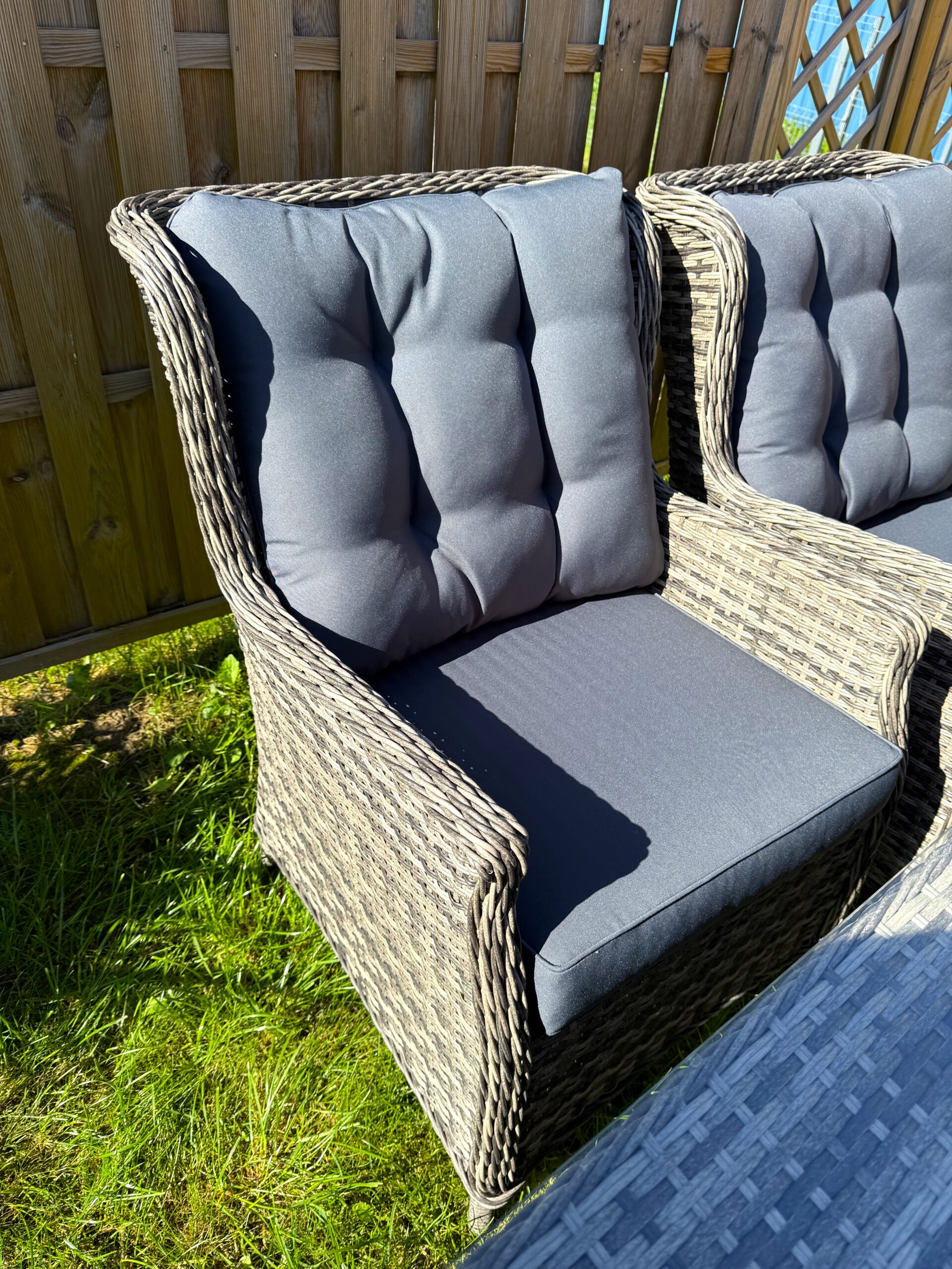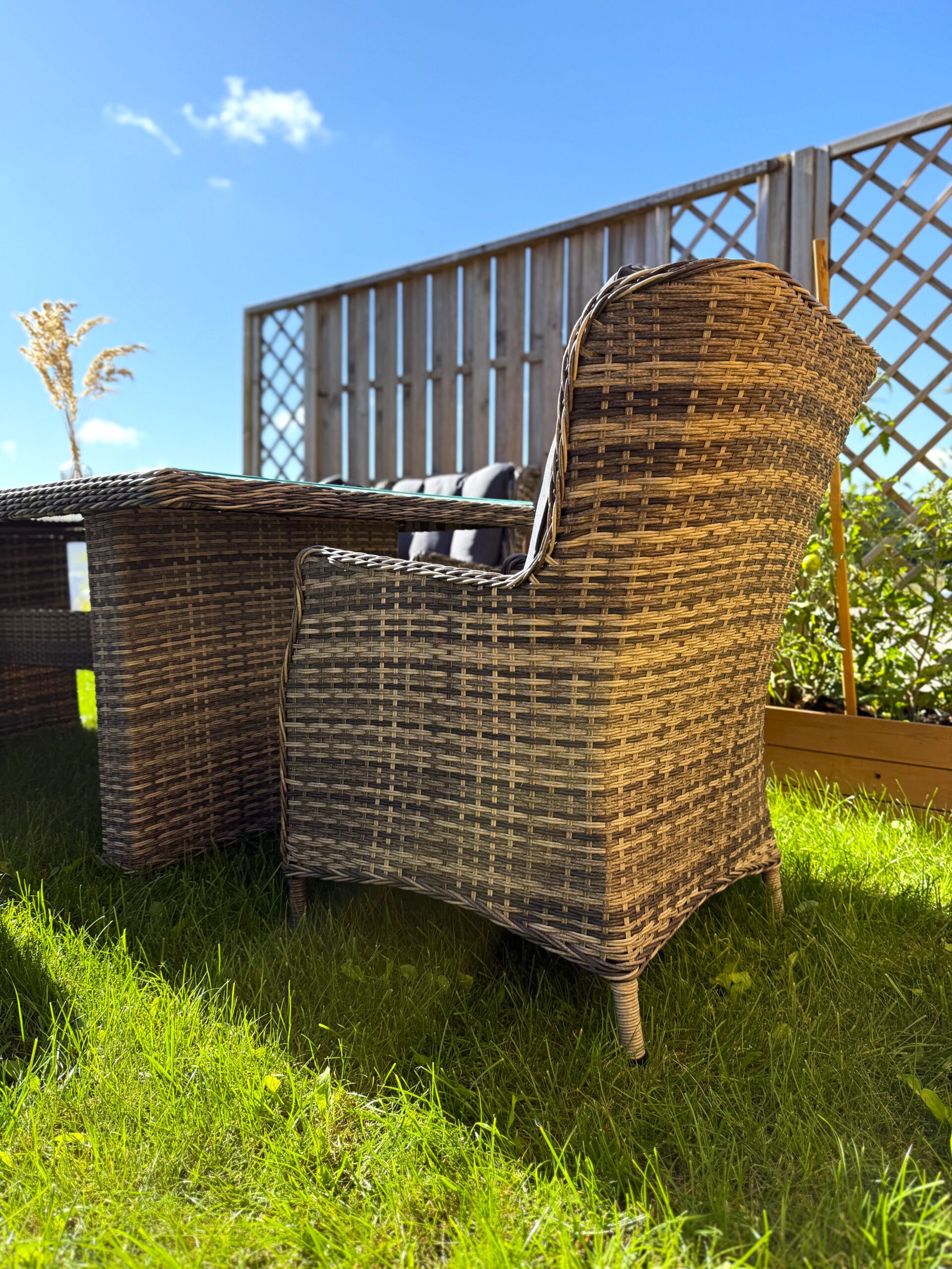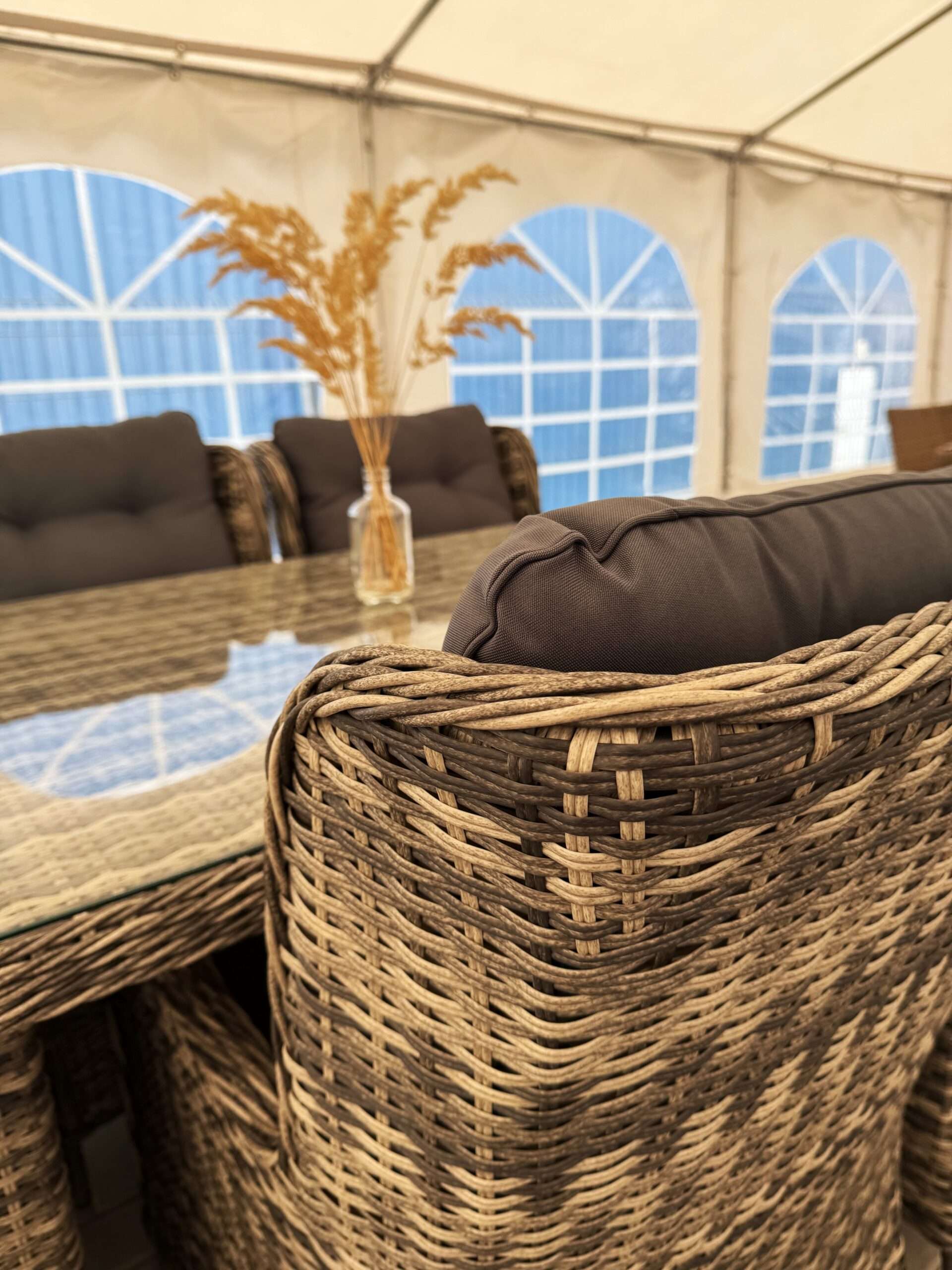 Mööblikomplekti raam on valmistatud pulbervärvitud alumiiniumist, mis tagab vastupidavuse. Sünteetilisest materjalist punutis, mis on kaetud veekindla materjaliga, annab mööblikomplektile loomuliku ja elegantse välimuse. Mööbli pehmed istmed ja padjad on valmistatud kvaliteetsest polüestrist, 10 cm paksuse täidisega, mis annab lisamugavuse. Laual on 5 mm karastatud klaas, mis annab ilusa ja esteetilise välimuse.