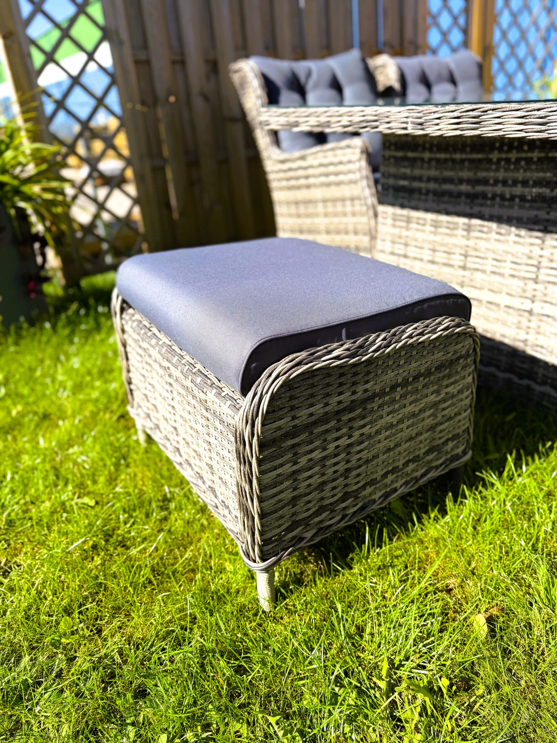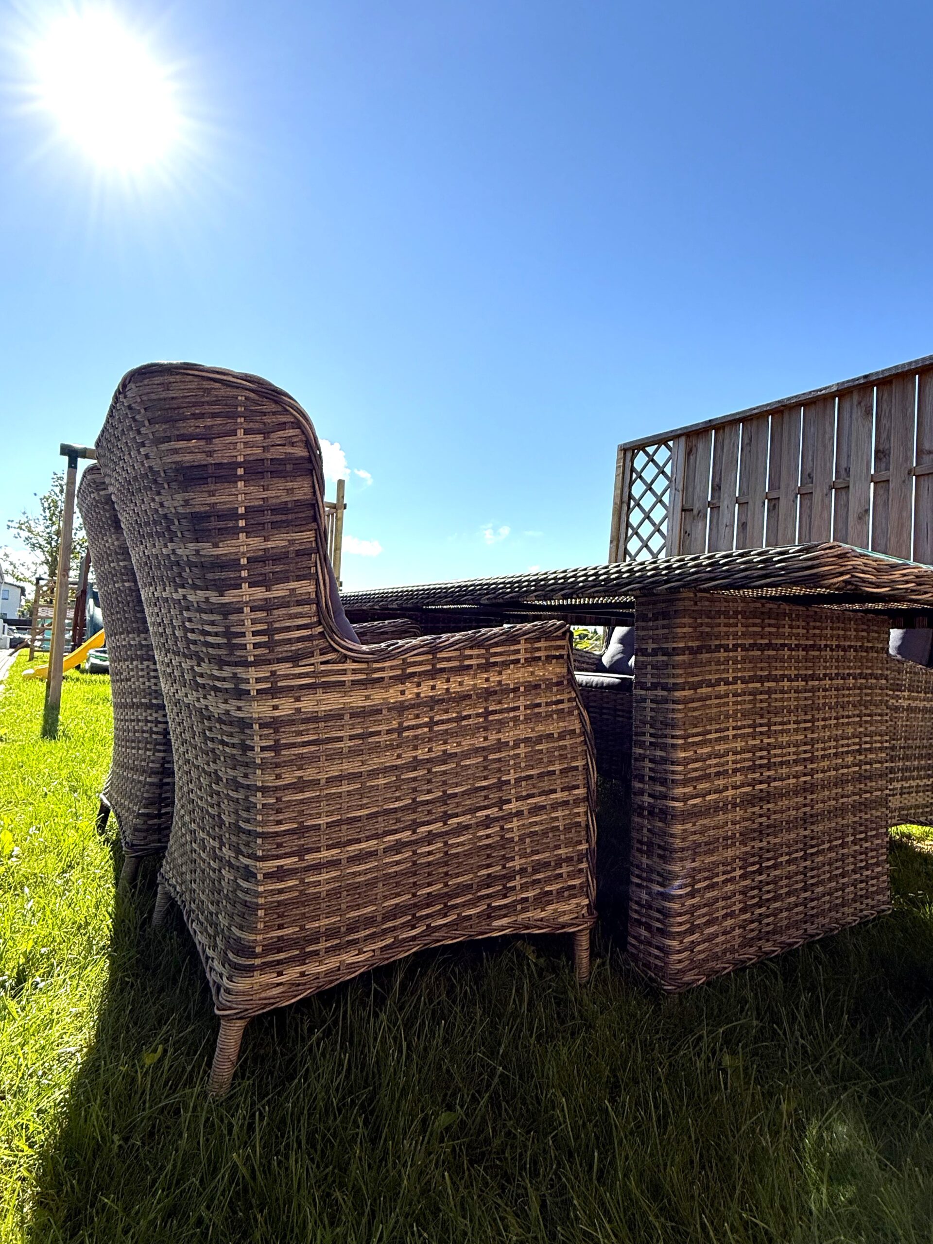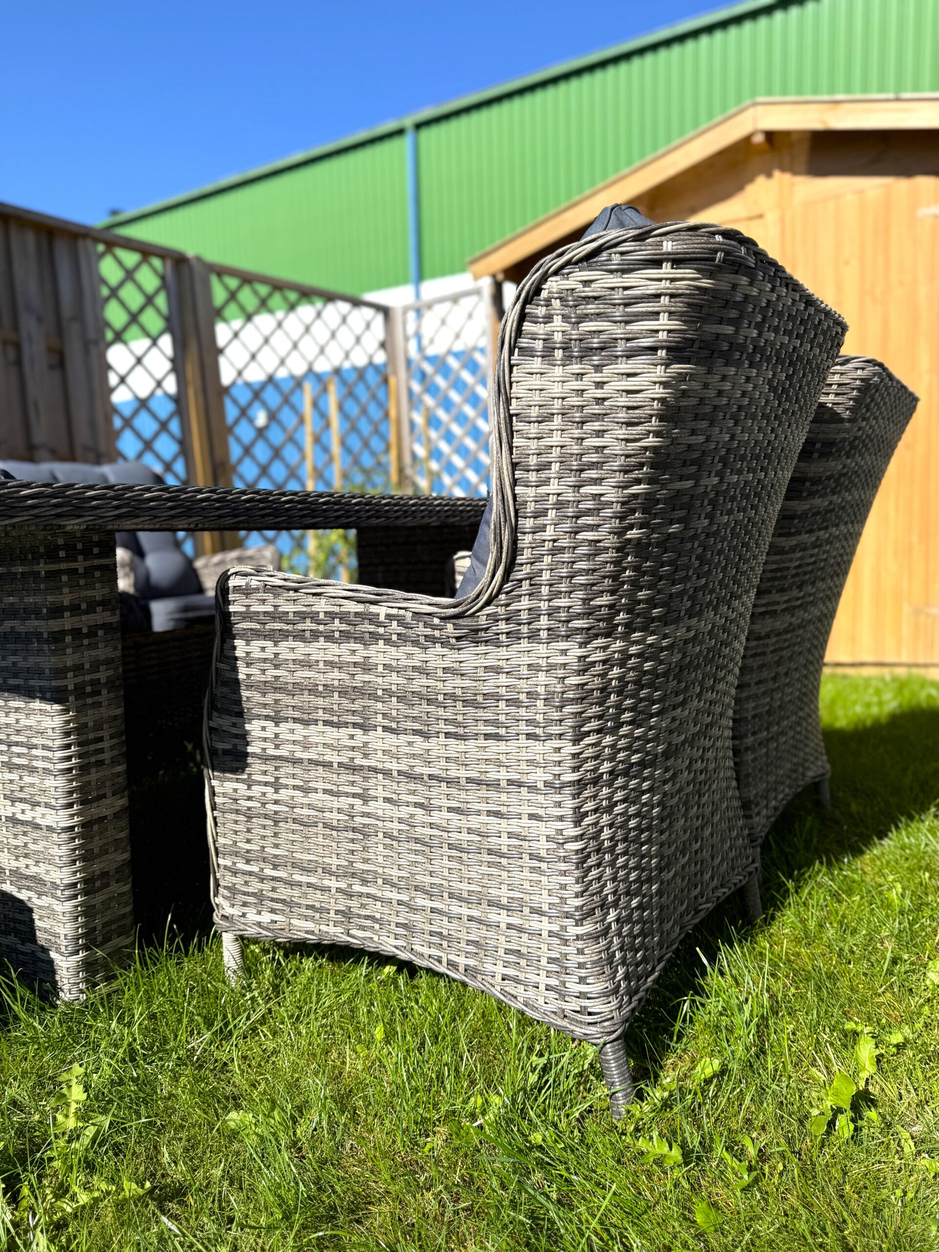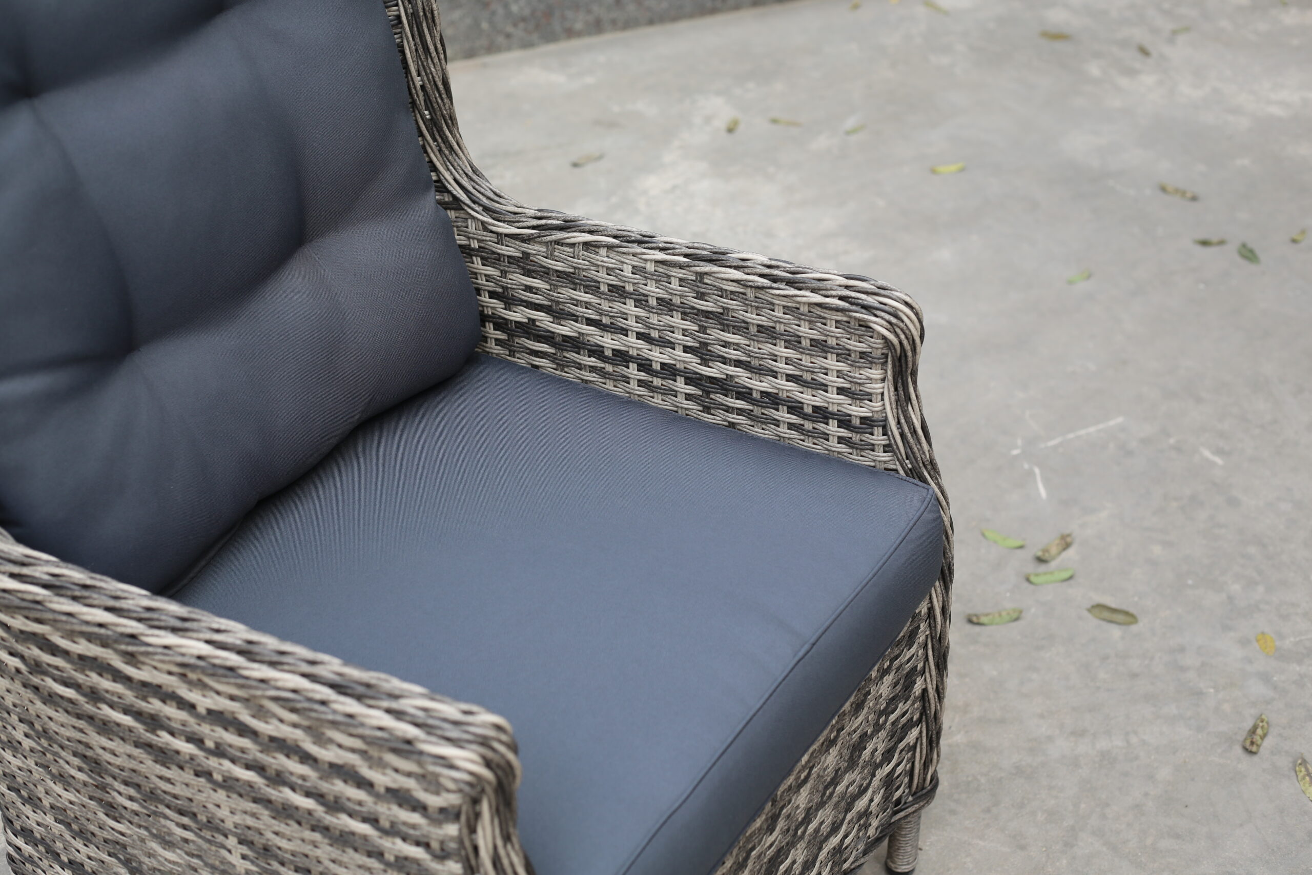 Mööblikomplekti raam on valmistatud pulbervärvitud alumiiniumist, mis tagab vastupidavuse. Sünteetilisest materjalist punutis, mis on kaetud veekindla materjaliga, annab mööblikomplektile loomuliku ja elegantse välimuse. Mööbli pehmed istmed ja padjad on valmistatud kvaliteetsest polüestrist, 10 cm paksuse täidisega, mis annab lisamugavuse. Laual on 5 mm karastatud klaas, mis annab ilusa ja esteetilise välimuse.