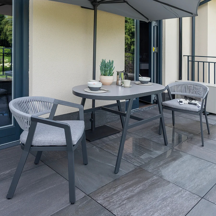 Toolidel olevad halli värvi pehmed, 5 cm paksused padjad tagavad maksimaalse mugavuse, et saaksite õues olemist pikalt nautida. Padjad on valmistatud 200 g/m2 polüestrist – need on ilmastikukindlad ja kergesti puhastatavad, muutes mööbli hoolduse lihtsaks. Laua stiilne ovaalne disain annab komplektile juurde modernsust ning selle pind on kergesti puhastatav, tänu millele sobib see ideaalselt õues kasutamiseks.