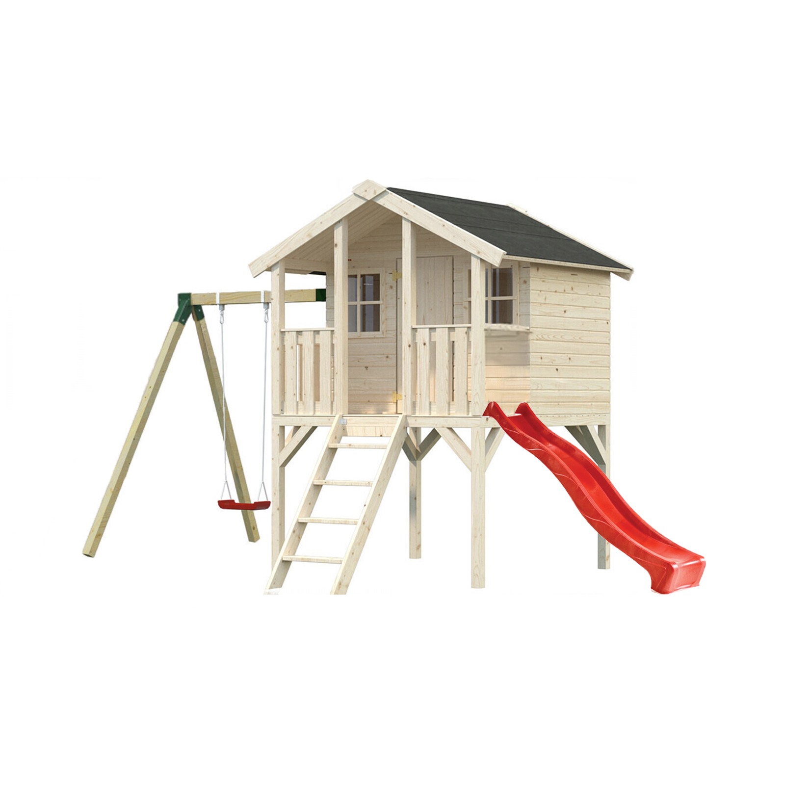 See ruumikas puidust mängumaja koos kiigeraamiga pakub palju tegevust ja tagab turvalise ja lõbusa aja veetmise õues. Mängumaja eriline disain – kõrgendatud konstruktsioon koos avara katuseterrassiga loob hubase ja mugava ruumi kõikvõimalikeks mängudeks. Lisaks on võimalik mängumaja platvormi alla paigaldada liivakast, millest saab veel üks põnev koht laste loovateks mängudeks ja erinevateks avastusteks.