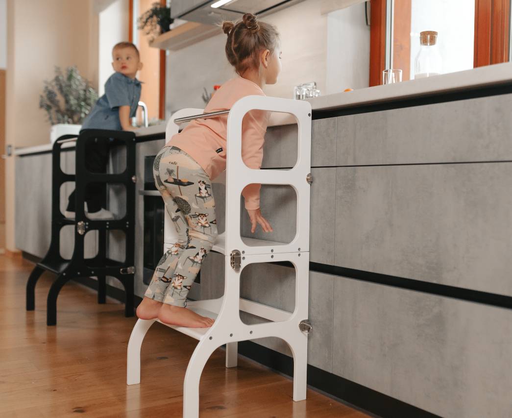 Puidust torntool arendab lastes uudishimu ja iseseisvust ning motiveerib neid kaasalööma igapäevastes majapidamistöödes. Abiastmete abil ulatavad lapsed ohutult kõrgematele pindadele ning saavad oma igapäevased tegevused lihtsamalt tehtud, nagu käte ja hammaste pesemine, nõude pesemine, köögitasapinna taga vanemate abistamine söögitegemisel. Abitooli saab lihtsalt muuta mugavaks istepingiga abilauaks, kus taga saavad lapsed süüa, joonistada, mängida erinevate mängudega või teha muid lemmiktegevusi. Hea praktiline lahendus!