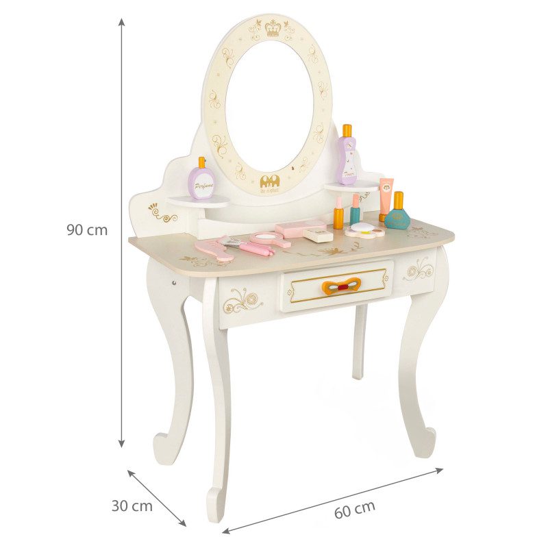 Iga tüdruk unistab oma ilunurgast, kus ta saaks tunda end tõelise printsessina. Ilusa disaini ja mustridega meigilaua komplekt rõõmustab pisikesi preilisi ning sobib ideaalselt lastetuba kaunistama. Peeglilaud on kaunistatud krooni ja lillemotiividega. Komplekt koosneb peegliga meigilauast, toolist ja ilutarvikutest. Kõik vajalikud ilu- ja meigiasjad saab mugavalt panna sahtlisse või suurele peeglilauale. Puidust peeglilauakomplekti elemendid on värvitud lastele ja keskkonnale ohutute värvidega.