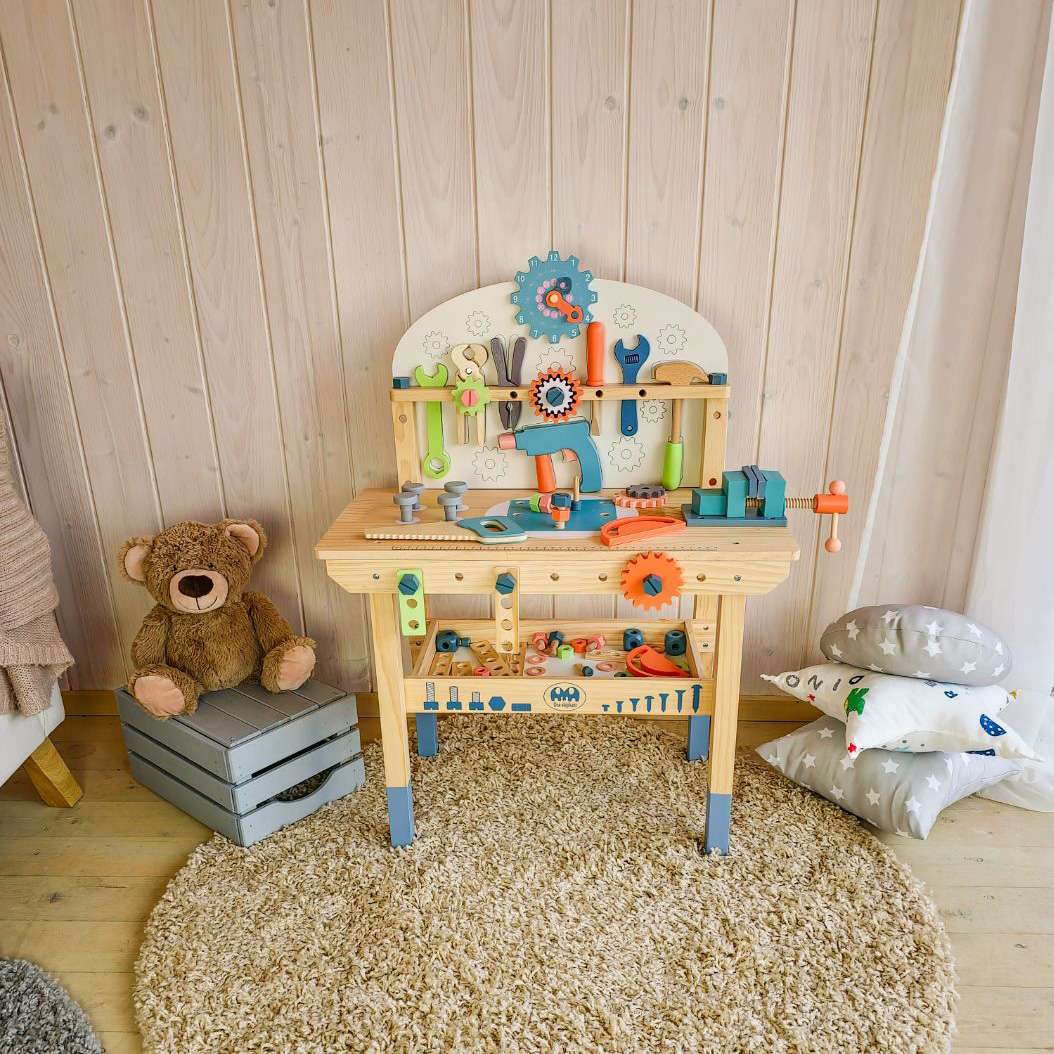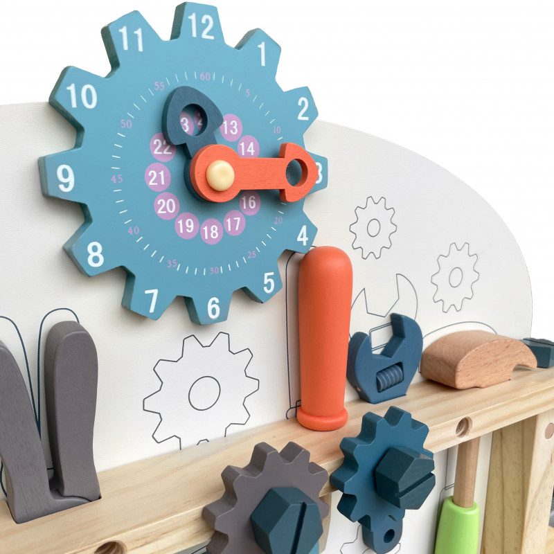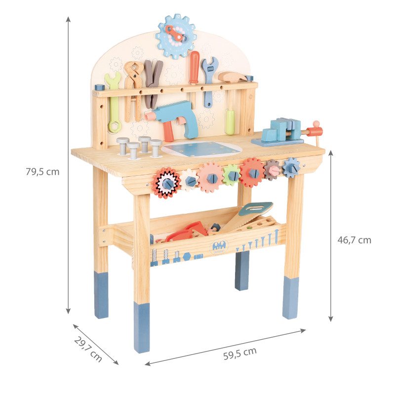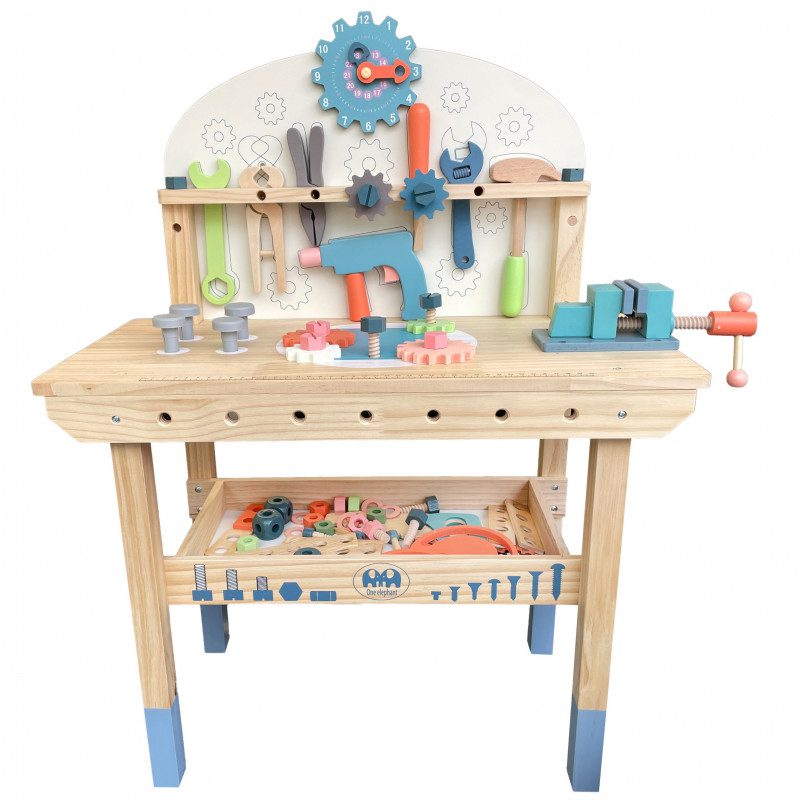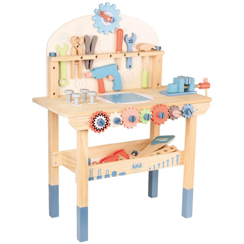 Tugev puidust töölaud koos tööriistade ja erinevate tarvikutega, mida ehitamisel vaja läheb. Komplektis on lastele mugavas suuruses haamer, mutrivõti, kruvikeeraja, mutrid ja poldid. Laua eesosas on liikuvad hammasrattad, paremal pool klamberkinnitus, laua all on koht tööriistade hoiustamiseks, üleval osas hammasrattakujuline kell, mida saab väga hästi kasutada ka õppeeesmärgil. Töölaua taga saavad väiksed meistrid parandada ja ehitada erinevaid asju ning seeläbi ka arendada oma kujutlusvõimet ning iseseisvust.