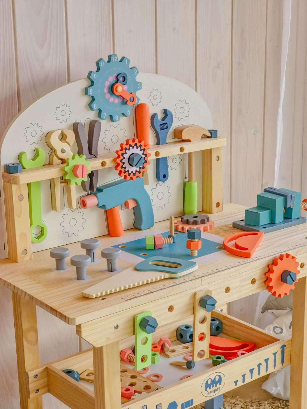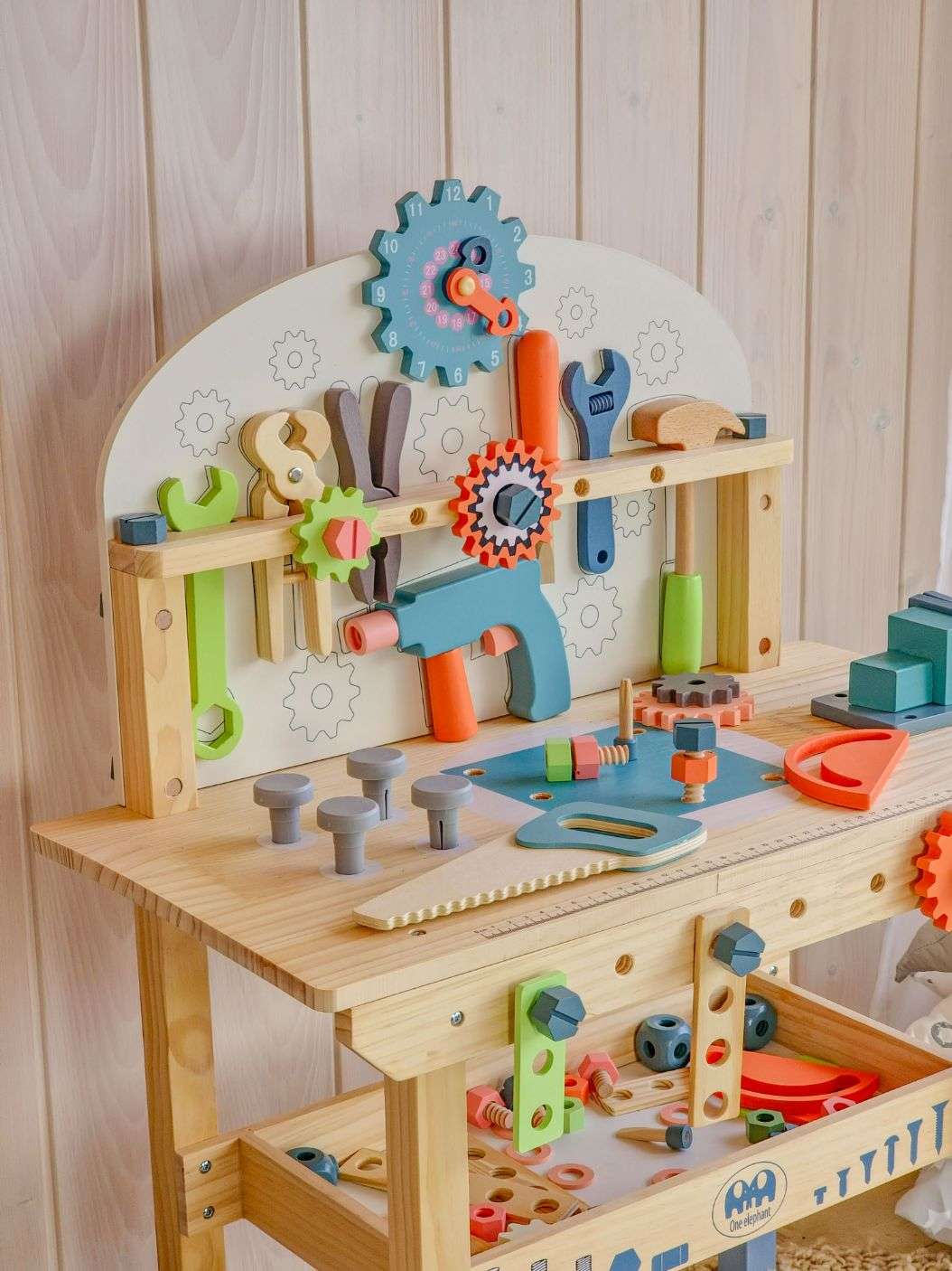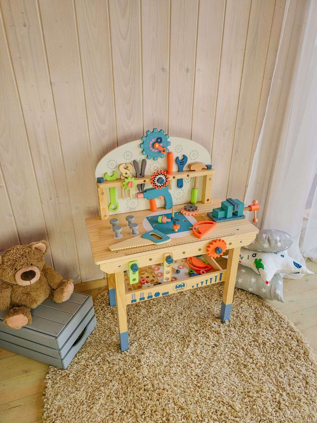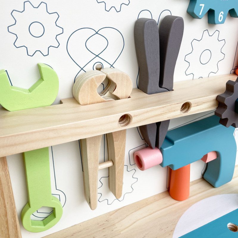 Tugev puidust töölaud koos tööriistade ja erinevate tarvikutega, mida ehitamisel vaja läheb. Komplektis on lastele mugavas suuruses haamer, mutrivõti, kruvikeeraja, mutrid ja poldid. Laua eesosas on liikuvad hammasrattad, paremal pool klamberkinnitus, laua all on koht tööriistade hoiustamiseks, üleval osas hammasrattakujuline kell, mida saab väga hästi kasutada ka õppeeesmärgil. Töölaua taga saavad väiksed meistrid parandada ja ehitada erinevaid asju ning seeläbi ka arendada oma kujutlusvõimet ning iseseisvust.