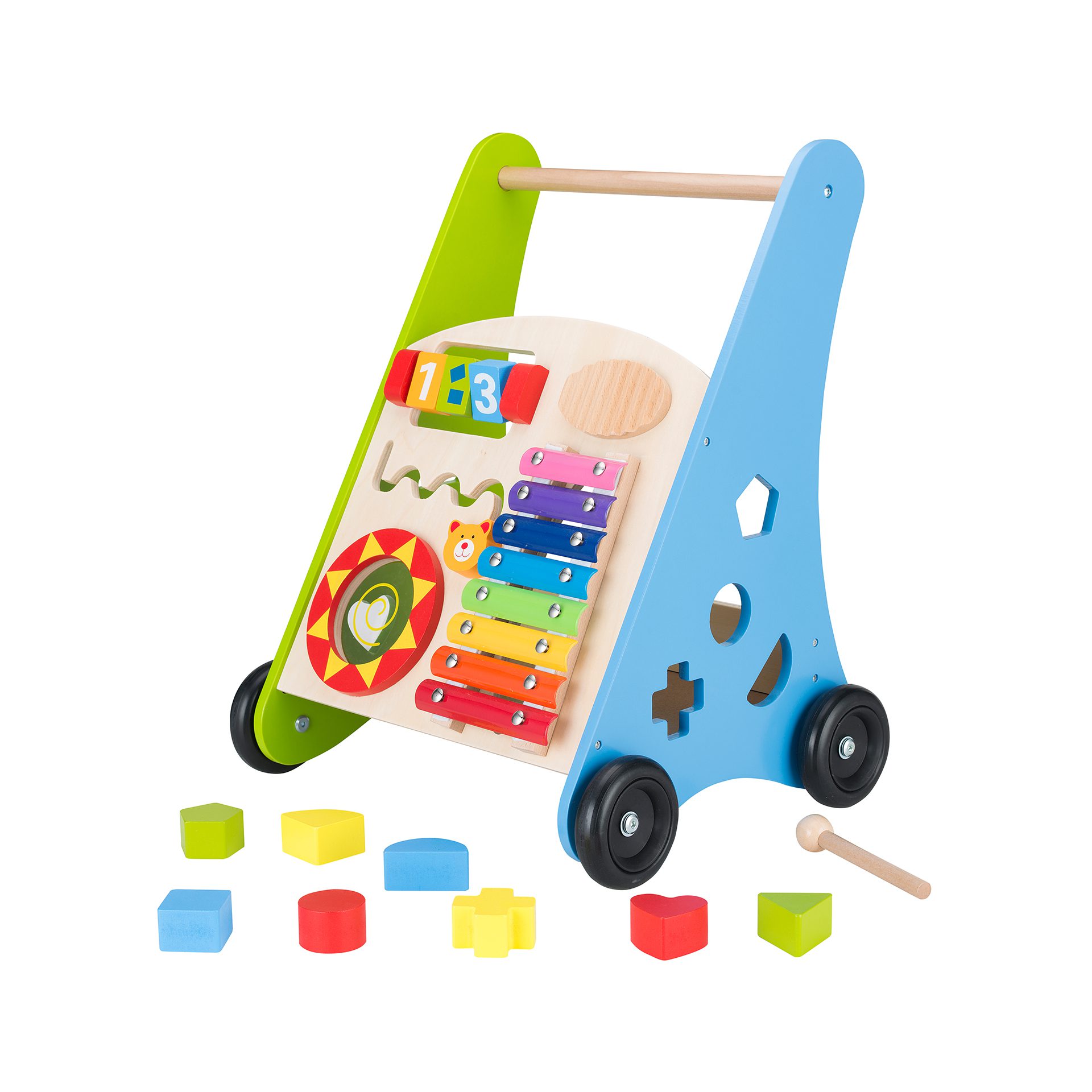 Sellel puidust käimistoel on palju mänguelemente, mis arendavad beebide koordinatsiooni ja motoorseid oskusi. Käimistugi sisaldab ka erineva kujuga mänguklotse ning pulka, millega trummi ja ksülofoni mängida saab.