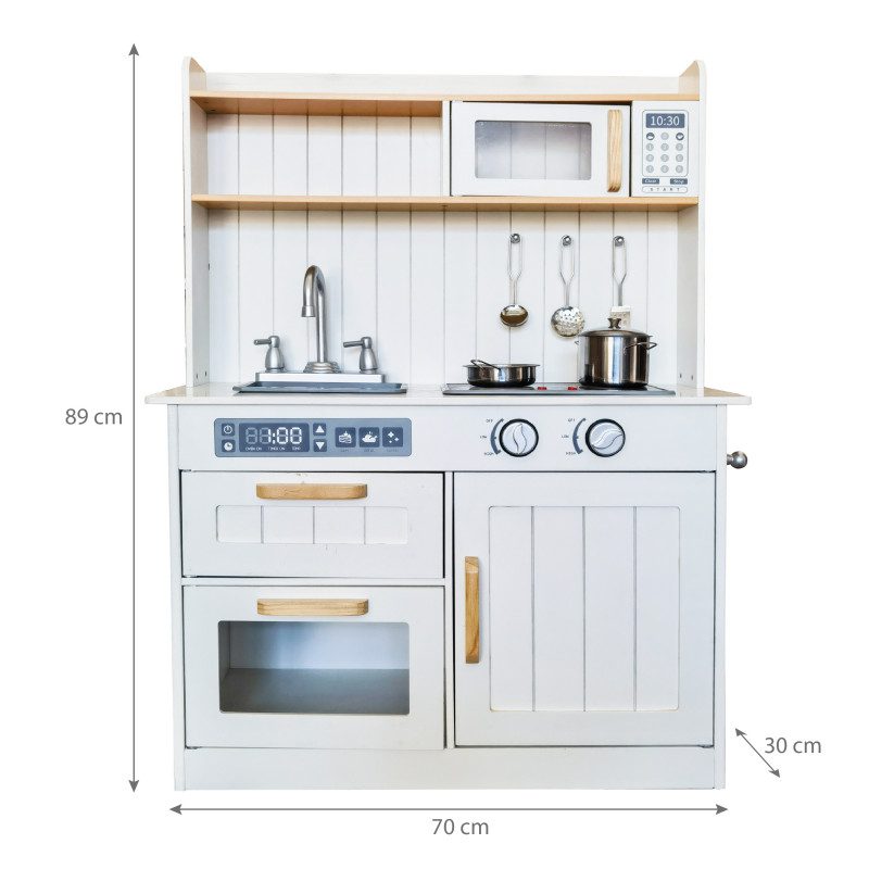 Stiilne köök väikestele kokkadele. Mänguköök on valmistatud kvaliteetsest puidust ning võlub oma ilusa ja realistliku disaini ning vastupidavusega. Puidust köögil on avatavad uksed, konksud köögitarvikute riputamiseks, erinevad metallist tarvikud (kaanega pott, pann ja köögiriistad) ja pisike nagi köögirätiku või kokapõlle jaoks – kõik need on abiks väikestele kokkadele, et erinevad maitsvad road valmiks võimalikult mugavalt. Mänguköök pakub kahtlemata palju rõõmu ning samal ajal arendab ka pisikeste loovust ja kujutlusvõimet.
