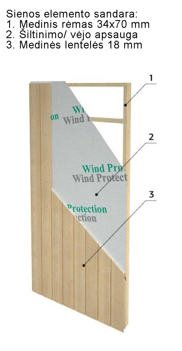 SEINAD. Seinakonstruktsioon koosneb monteerimisvalmis seinaelementidest, mis on seest kaetud tuuletõkkekilega. See pakub täiendavat kaitset vihma või puhangulise tuule eest. Seinaelementide kogupaksus on 88mm – 70mm karkasskonstruktsioon, vihma- ja tuulekindel isolatsioonikile ning 18mm puidust vooder (konstruktsiooni välisosas).