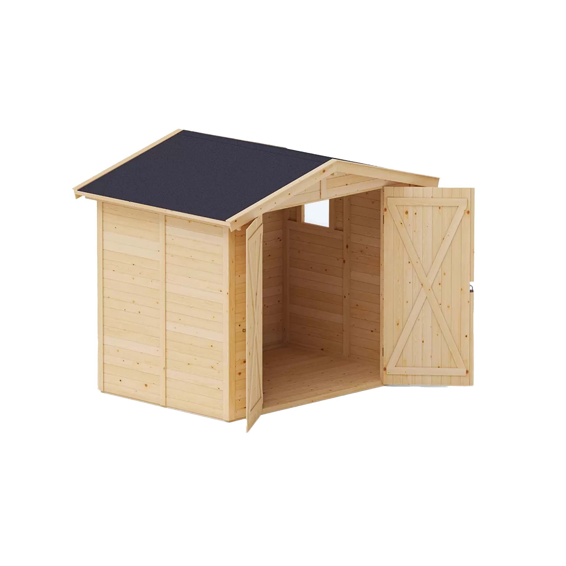 AKNAD JA UKSED. Komplekti kuulub kahele poole avanev hingedega puidust uks, mis on suletav riiviga. Ukse suurus 160 x 180 cm. Seinamoodulid on identsed, seega saab ise valida kummale poole aknaga külg paigaldada. Akna suurus 33 x 33 cm.