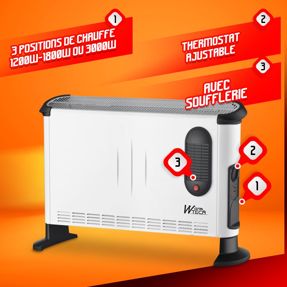 Soojendusvõimsus – kolm positsiooni: 1200 W, 1800 W või 3000 W
